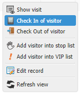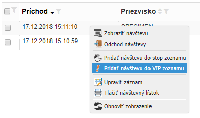 1 ) V zozname prítomných návštev vyvolať kontextové menu. V kontextovom menu bude prítomná voľba “Príchod návštevy“. Vybraním tejto voľby sa zaznamená vstup návštevy.