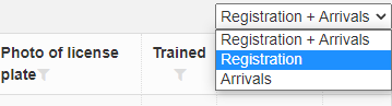Nad zoznamom prítomných návštev sa nachádza výberové pole kde si vrátnik môže filtrovať zoznam prítomných návštev- Registrácie + Príchody