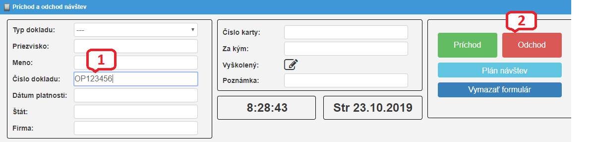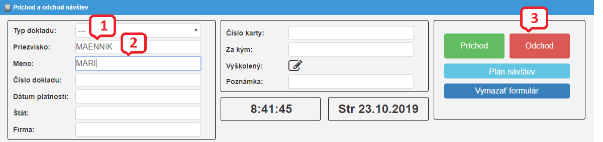 Obrazovka Príchod a odchod, slúži na evidenciu príchodu a odchodu návštevníka.