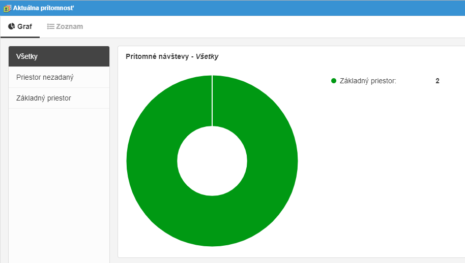 Obrazovka zobrazuje údaje o aktuálne prítomných návštevách, resp. štatistiku za aktuálny deň.