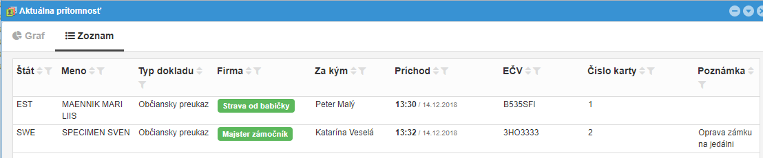 Obrazovka aktuálna prítomnosť zobrazuje prehľad prítomných návštev: