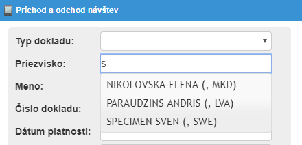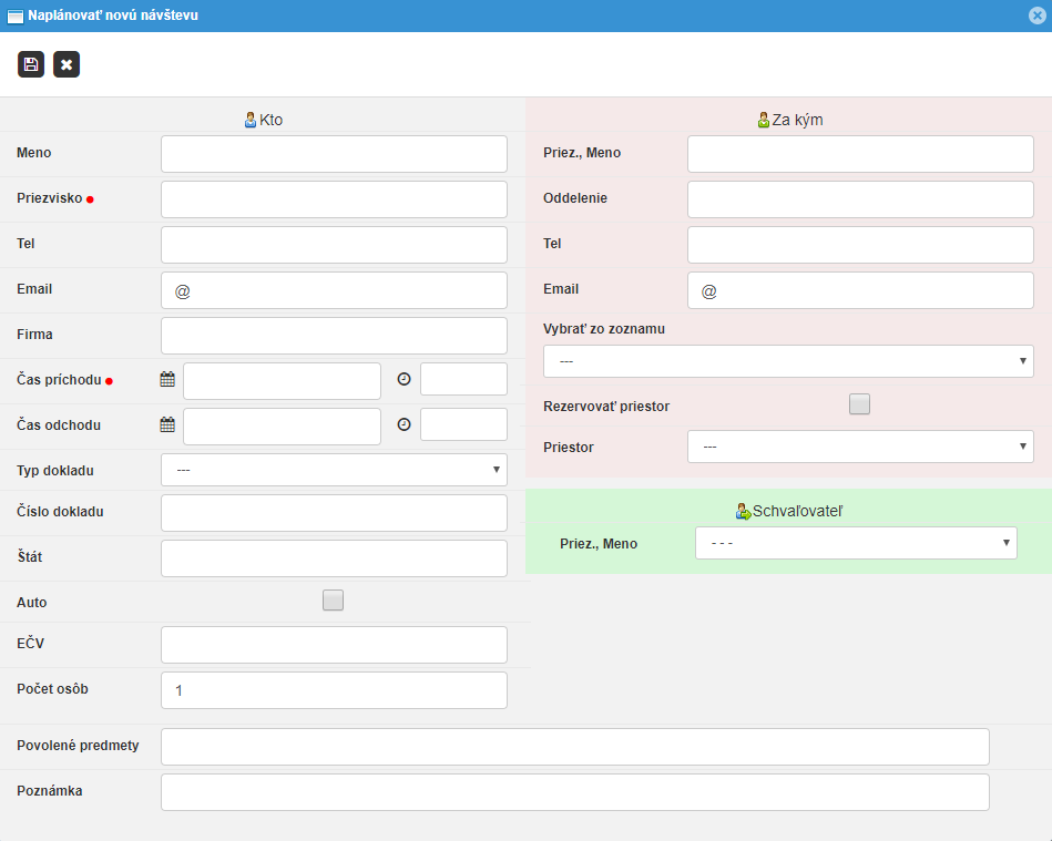 Je potrebné vyplniť formulár informáciami o návšteve (napr. priezvisko, meno, číslo dokladu, za kým návšteva ide, číslo návštevnej kartičky a iné). Vyplniť formulár je možné