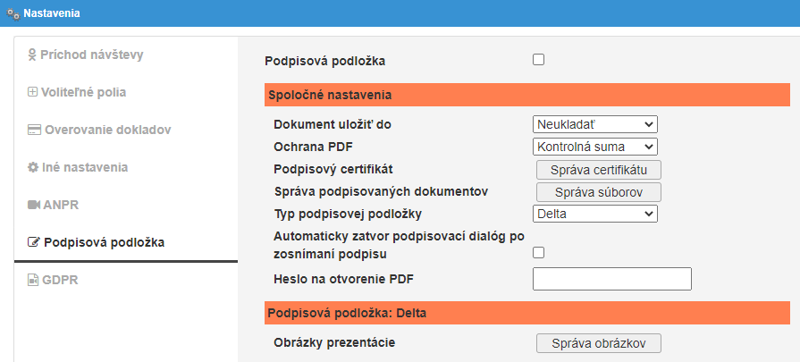 Slúži na nahranie / zmazanie certifikátu ktorým bude PDF dokument digitálne