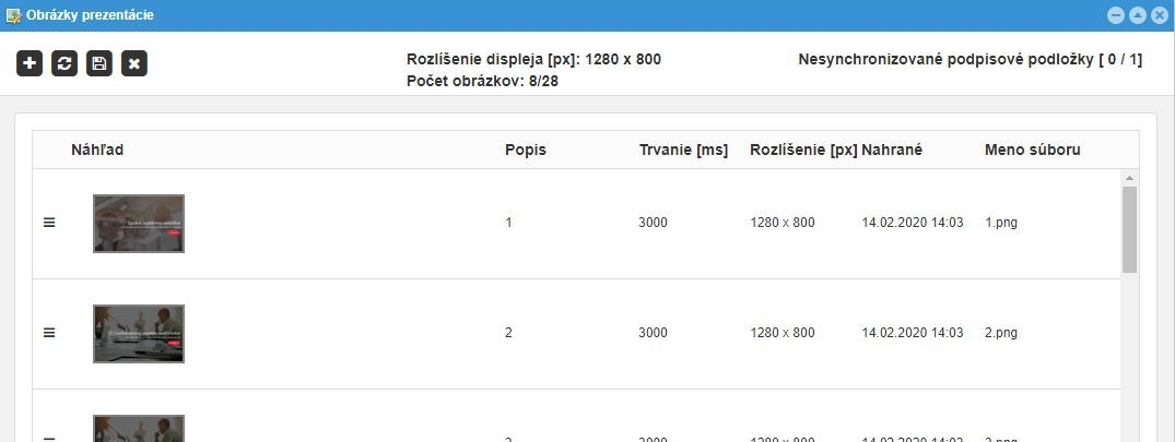 Obrazovka slúži na správu obrázkov zobrazovaných na podpisovej podložke Delta pokiaľ neprebieha čítanie / podpisovanie dokumentu. Obrázky sú prehrávané cyklicky. Každý obrázok sa zobrazí na čas nastavený pre daný obrázok. Východzia hodnota zobrazenia každého obrázku je 3 sekundy.