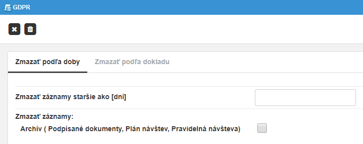 V okne je možné ručne spustiť kontrolu a automatické mazanie všetkých návštevných záznamov starších ako zadaný počet dní (rešpektovaním hodnoty „Minimálna doba uloženia údajov“ - pozri Záložka GDPR 3.9.6). Takisto je možné ručné zmazanie návštevných záznamov podľa čísla dokladu, napr. podľa čísla Občianskeho preukazu.